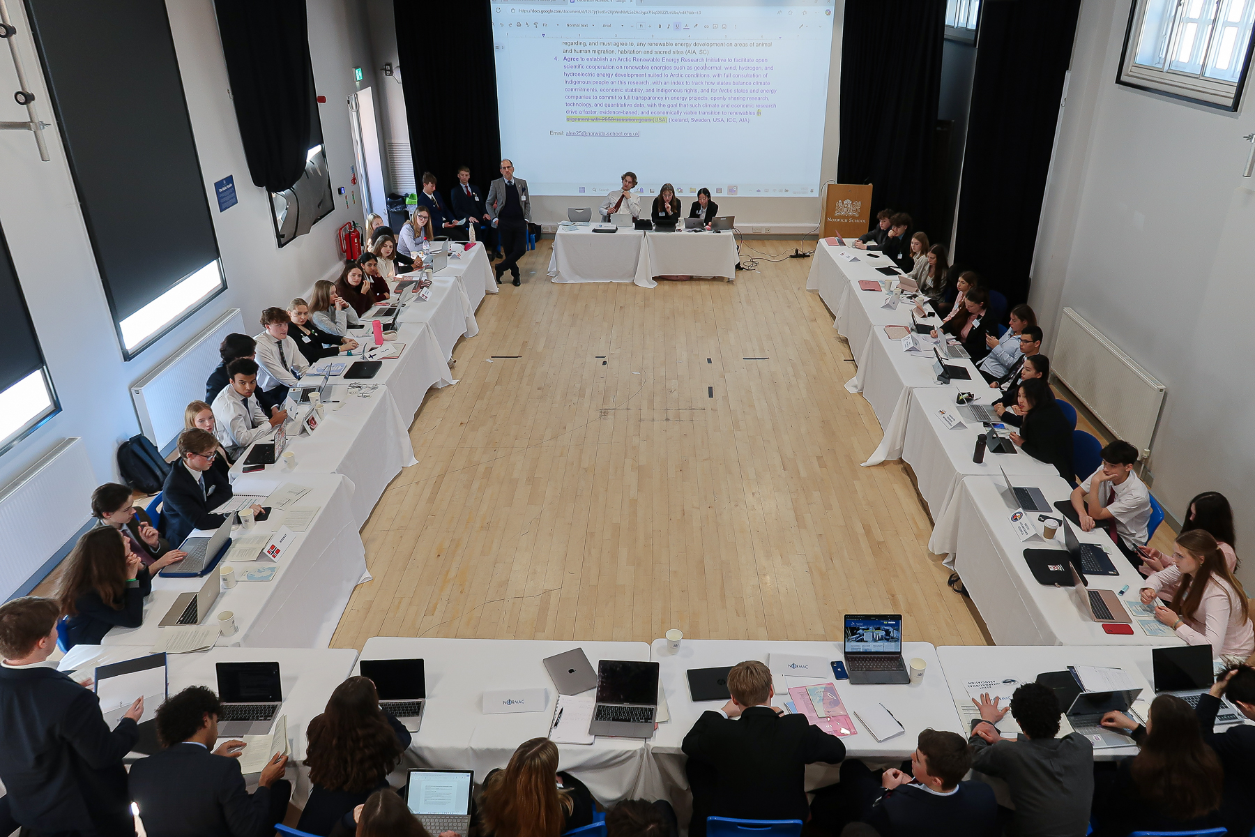 Over 50 pupils took part in NORMAC 9 — 42 delegates from five schools, plus 11 NORMAC Secretariat staff from Norwich School, our long-standing and generous host school. Over the course of the conference, delegates grappled with the complex questions of the so-called ‘Last Ice Area’, and of renewable-energy development in the Arctic. They benefited from the assistance of the NORMAC Secretariat, who served as meeting facilitators and rapporteurs, and they and the Secretariat together also benefited from ‘debriefing sessions’ after each day of negotiations, at which they could reflect on the course of their discussions, as well as about what they had learned.